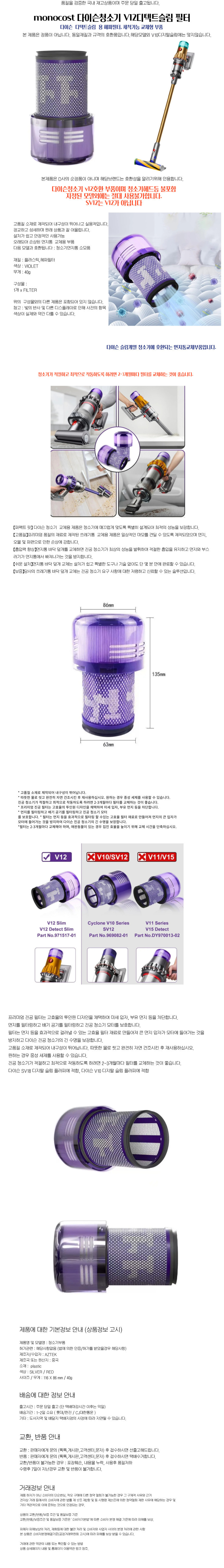 호환 청소기 V12 디텍트슬림 필터 교체 부품 세척가능